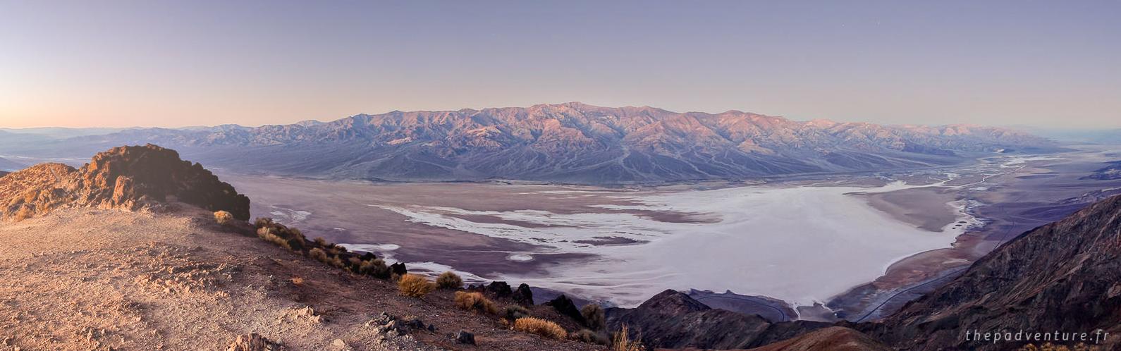 Dante’s view est une randonnée qui mène a un belvédère qui culmine a plus de 1675 mètres et qui offre une vue panoramique exceptionnelle sur toute la Vallée de la Mort et sur les montagnes environnantes. Le blanc que vous voyez au premier plan c’est Badwater Basin.
